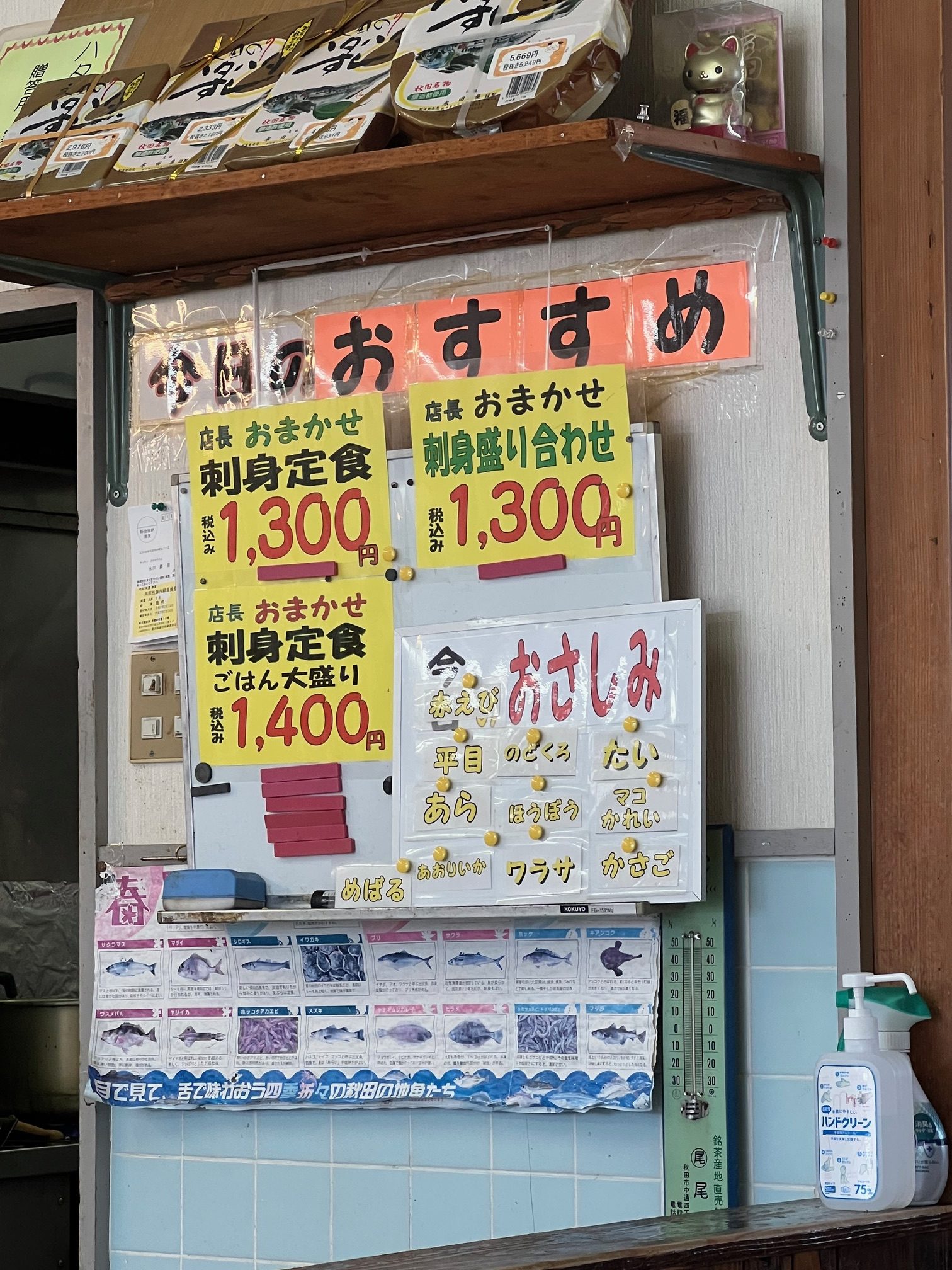 私の「おまかせ刺身定食」はなんと8種類もの刺身が盛り付けられていて、家族にも分けて食べました。もう一方のかさごの煮魚も活きが良かったので、美味しい品でした。私たちが出るころには5~6組が待っていたと思います。