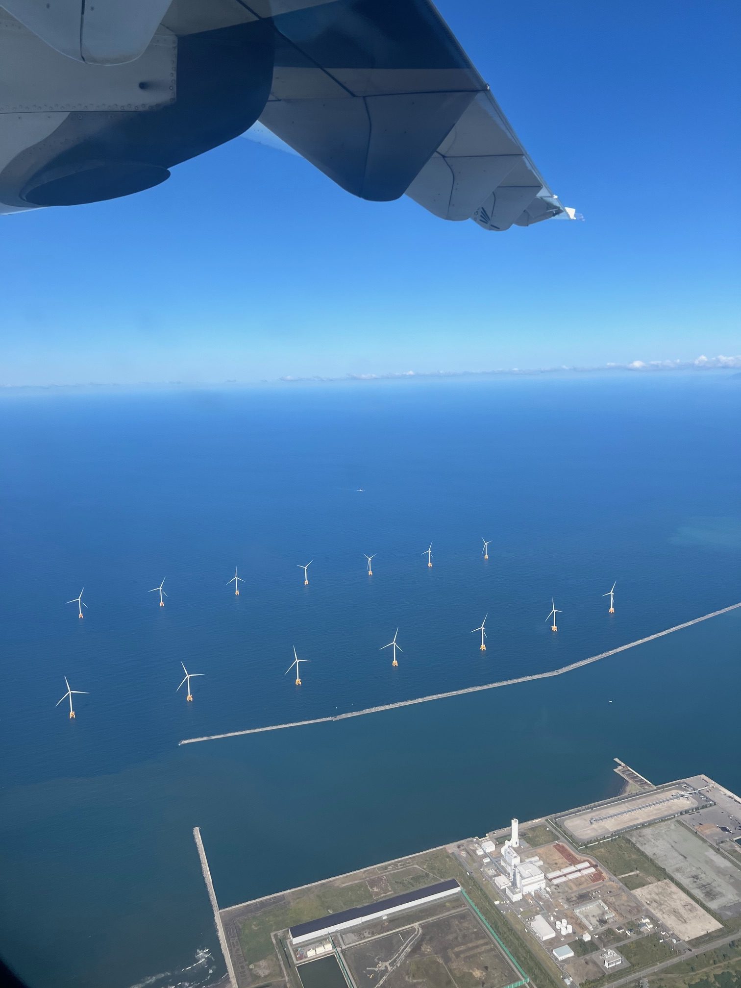 北海道からの帰路、丘珠空港を離陸してまもなく、洋上風力の風車を目にしました。結構多く立ち並んでいました。