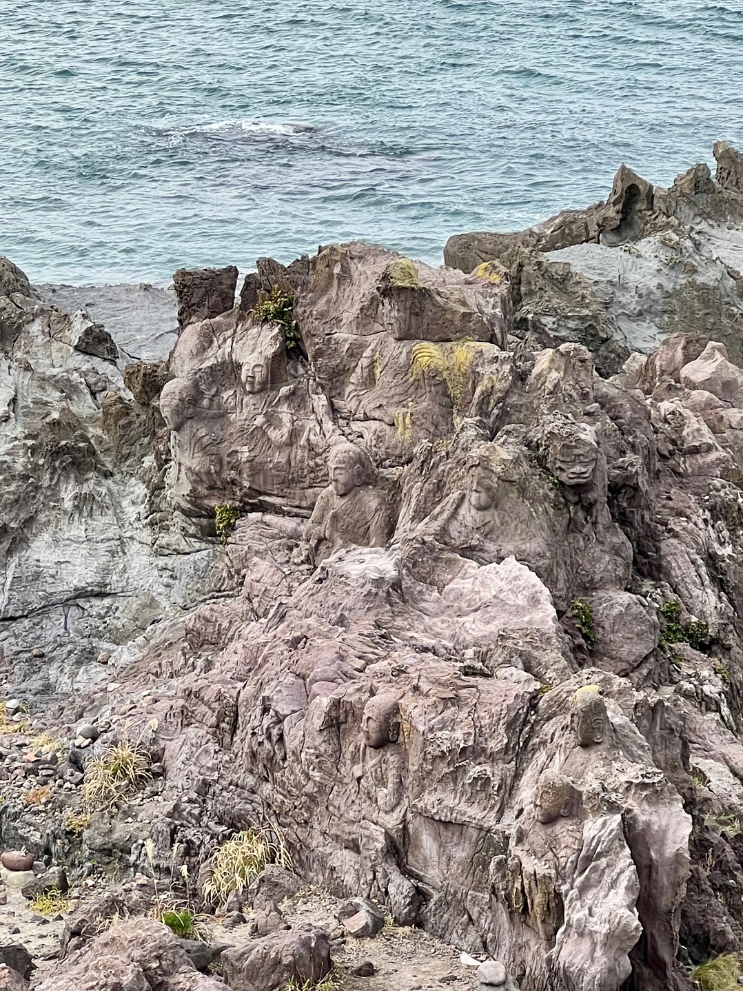 庄内・あつみ温泉の帰路、写真のように「鳥海山」と山形県遊佐町吹浦にある「十六羅漢」に立ち寄りました。