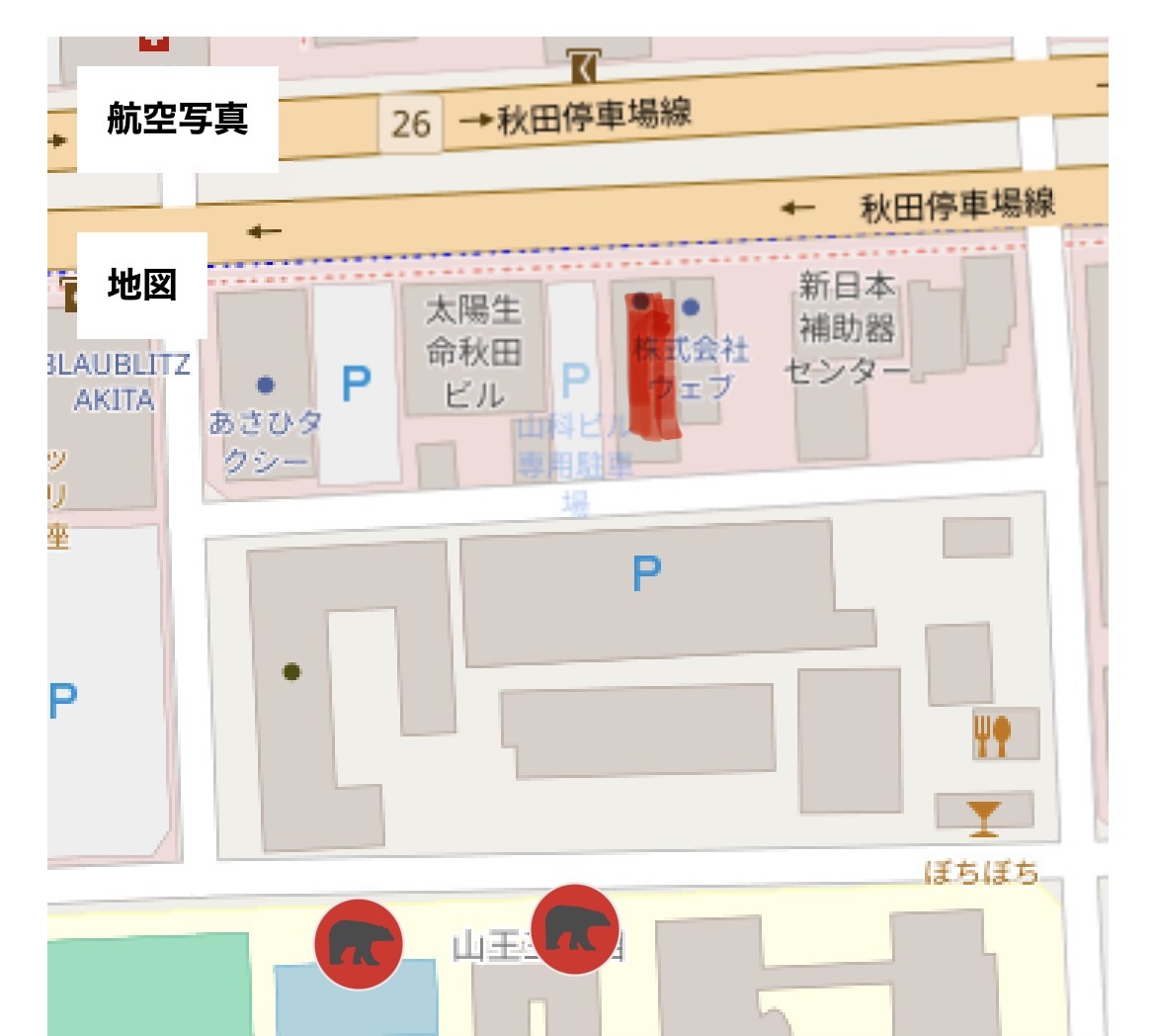 2枚目の写真はその交差点から近い会社の裏手。どちらの写真も赤く塗った場所が会社のビル。