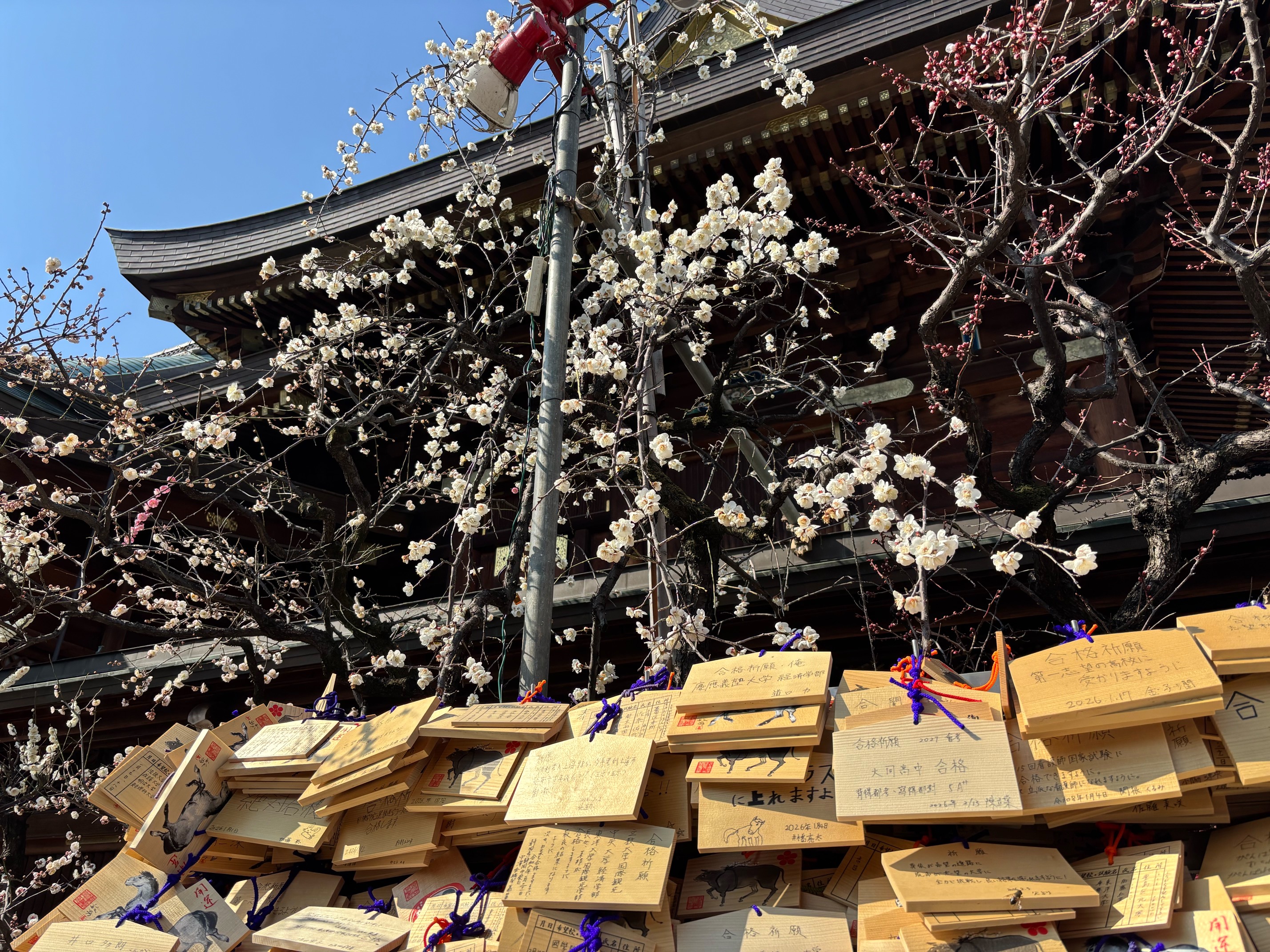 湯島天神らしく合格祈願でしょうか、絵馬が沢山結び付けられていますね。