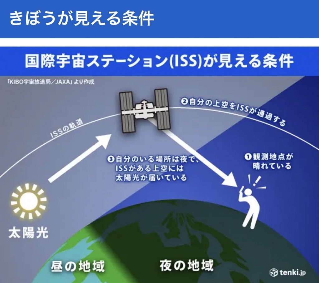 地上400km上空にあるため、地上の日が落ちてからしばらくの間は太陽に照れされ、そのタイミングなら太陽の光を反射して明るく輝き見えるのだそうです。