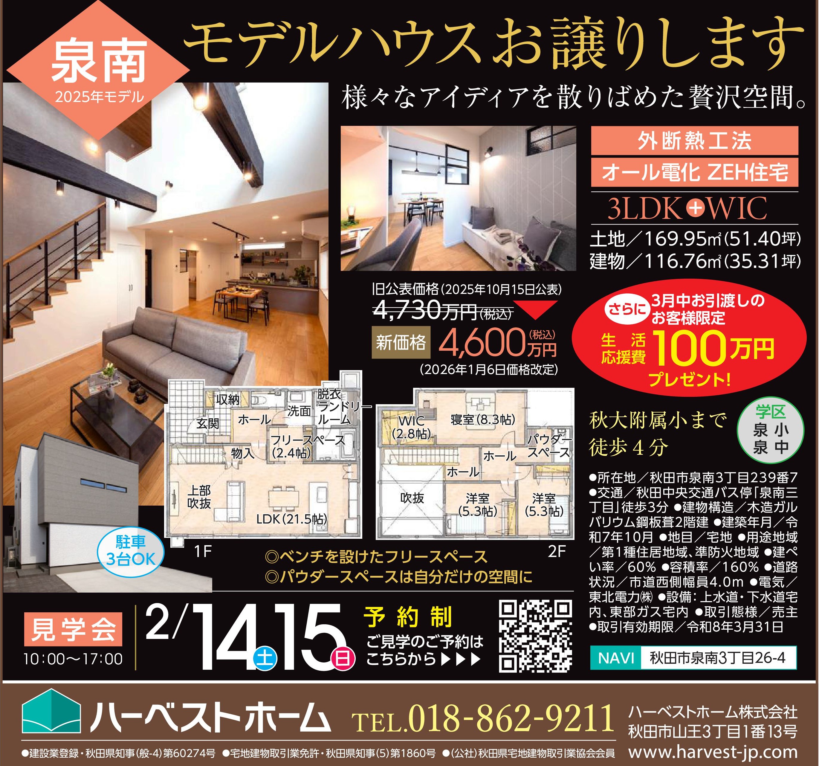 価格改定+100万円の生活応援プレゼント中! 10:00~17:00 予約制です。 広告のQRコード・ホームページの予約画面・お電話等でご予約お願いいたします。 「おうち時間を自分らしく」をコンセプトに建てられた住宅 秋田市泉エリアに物件をご検討中の皆様には是非ご検討いただきたい価値ある一棟です。