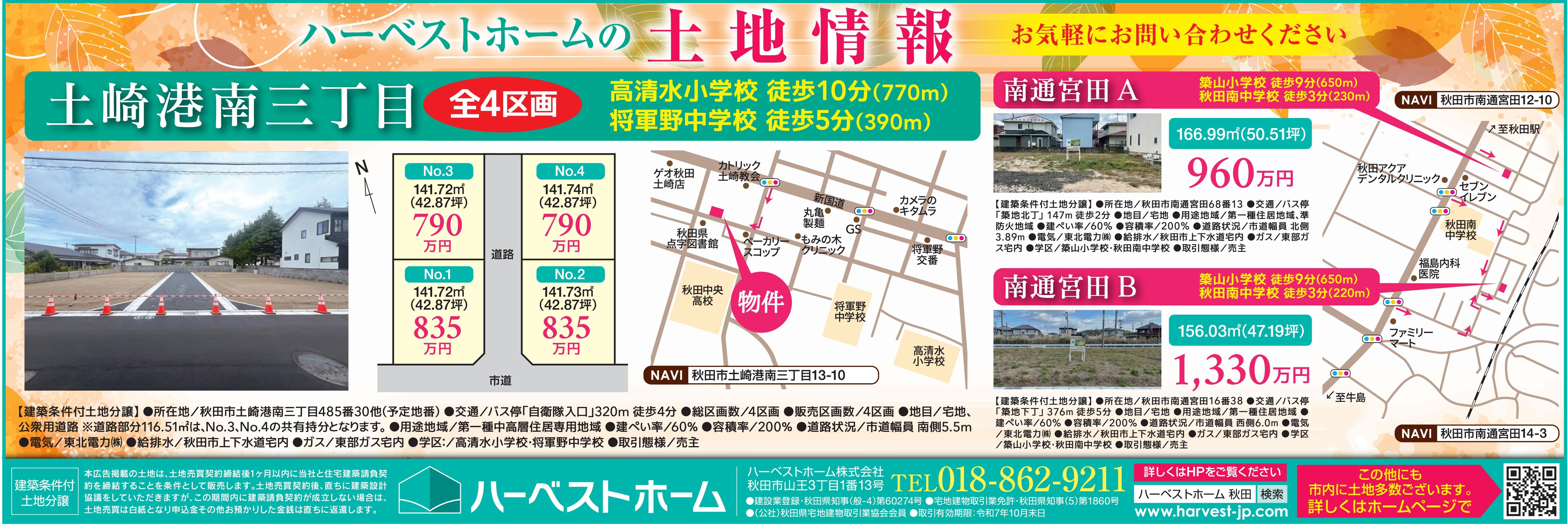 土地情報「秋田市土崎港南3丁目」「秋田市南通宮田A」「秋田市南通宮田B」 | ハーベストホーム株式会社