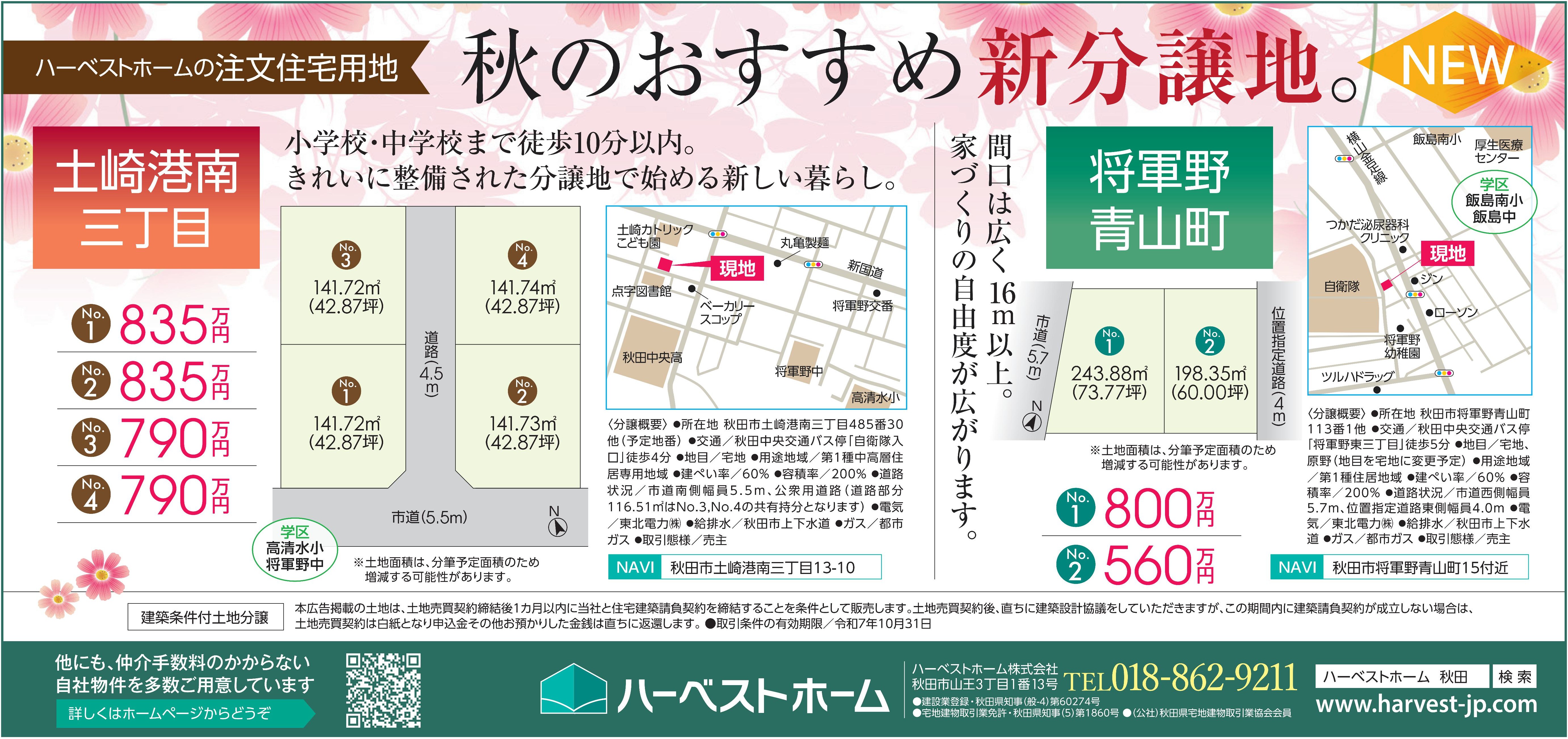 秋のおすすめ新分譲地「秋田市土崎港南3丁目」「秋田市将軍野青山町」
