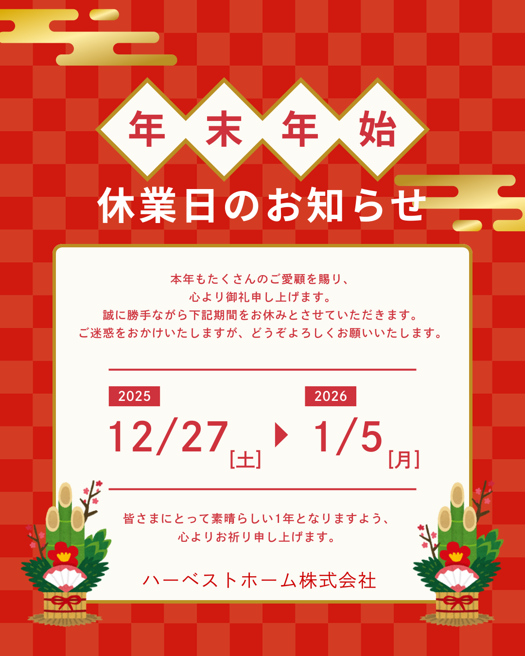 年末年始休業 2025年12月27日㈯ ~ 2026年1月5日㈪