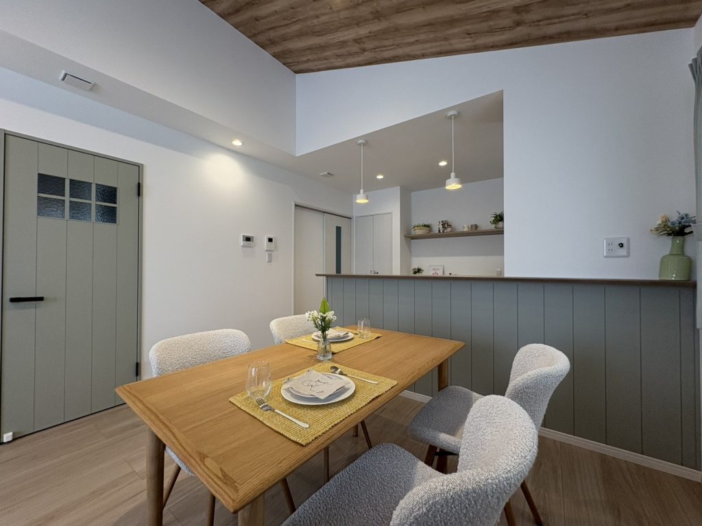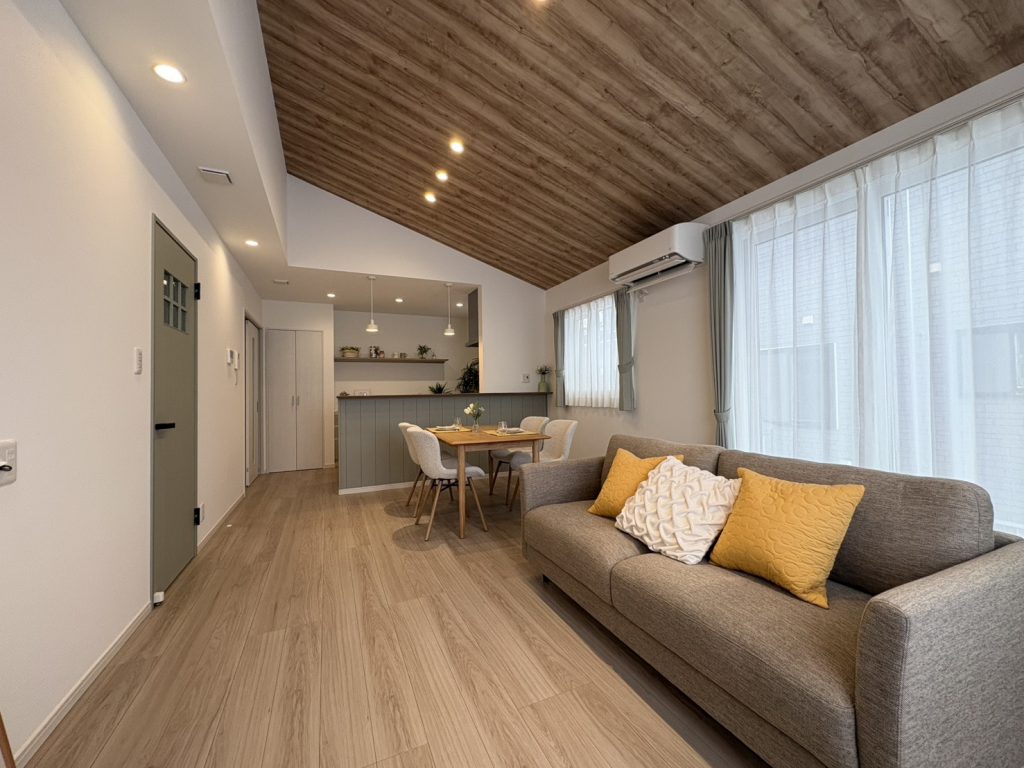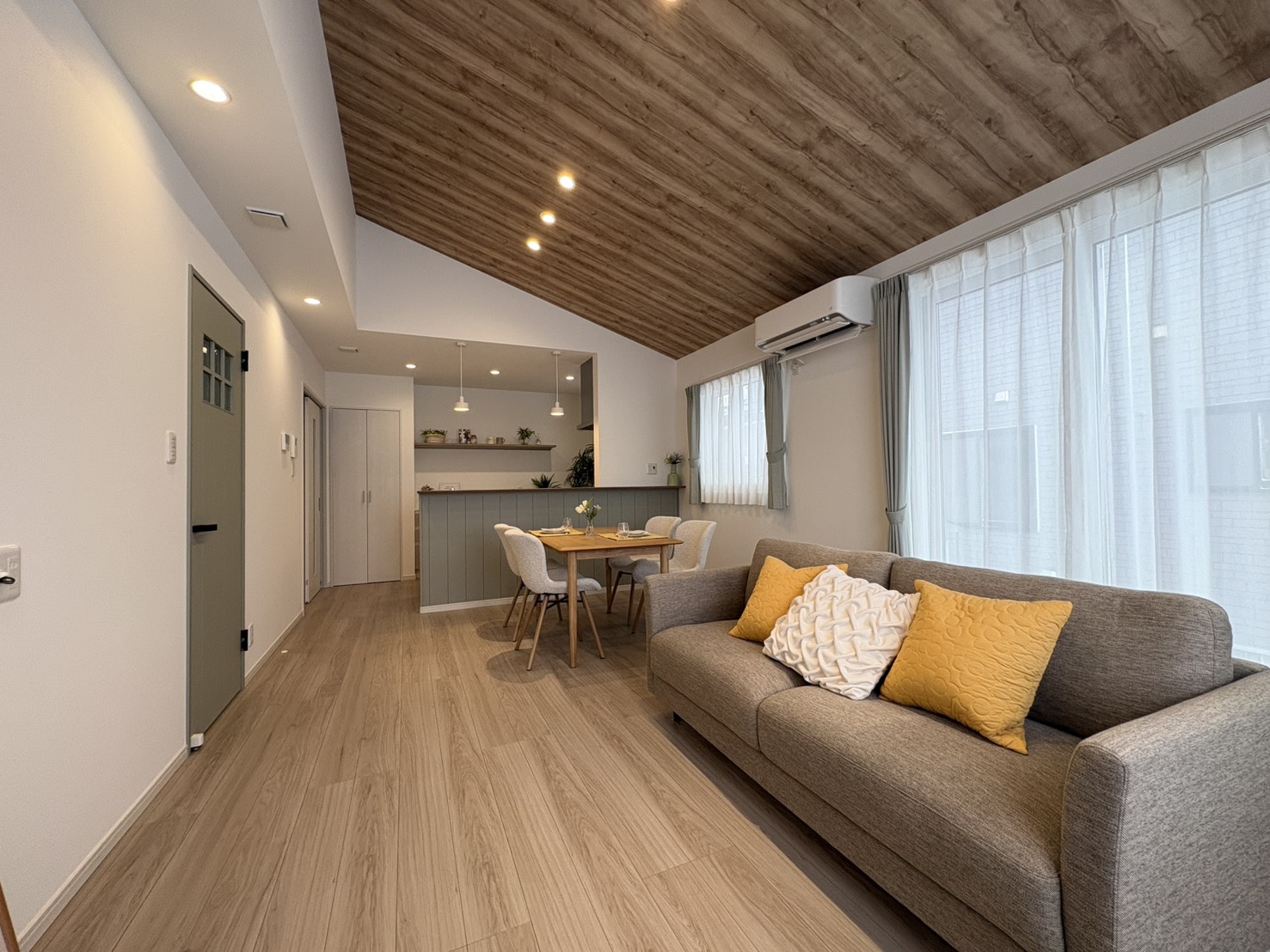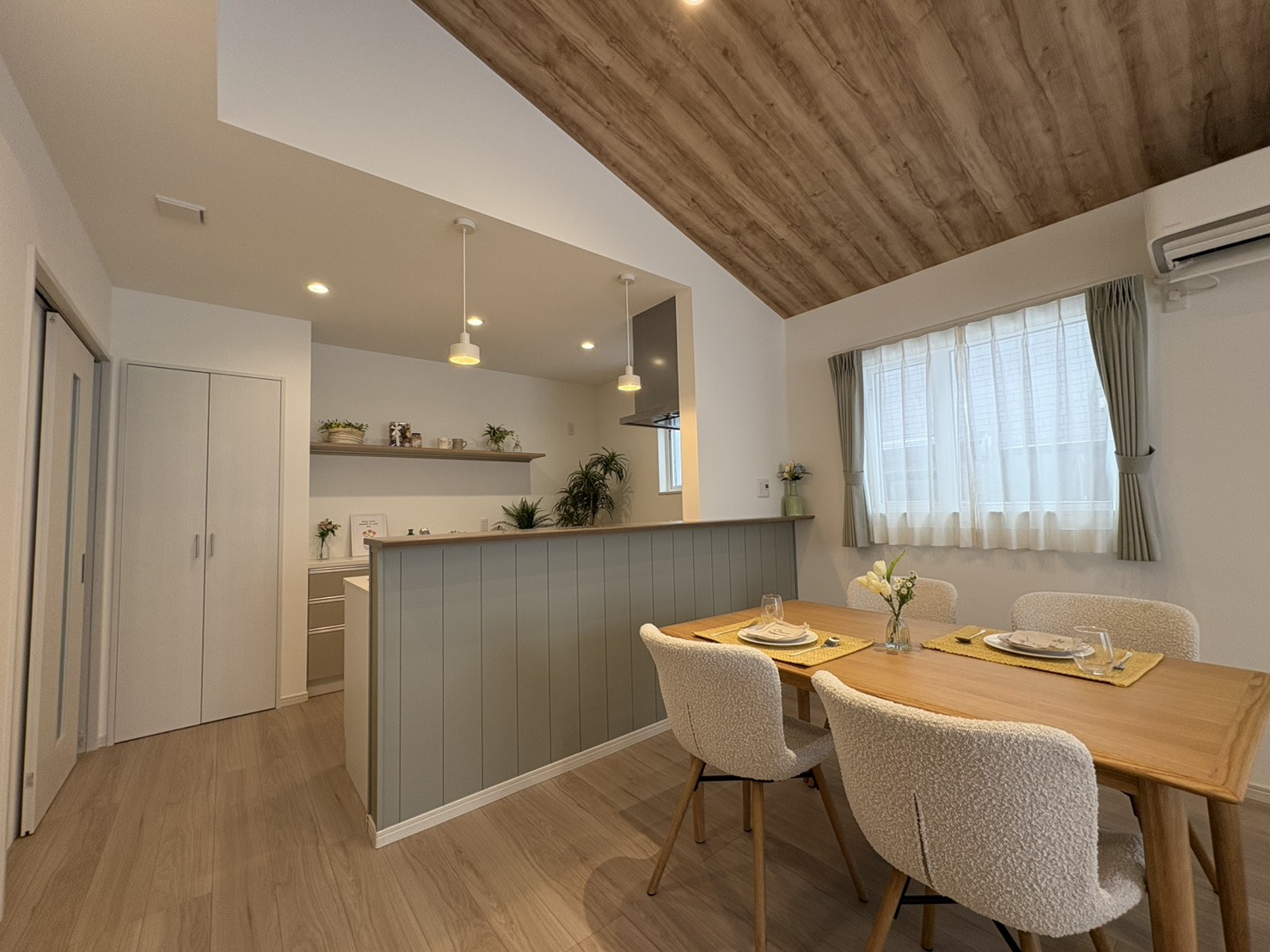 平屋の3LDK+ファミリークローゼット 動線が工夫された間取り。 リビングダイニングは勾配天井で空間も広々です。 飯島小学校まで徒歩8分 前面道路は15.8mの広さで歩道もあり通学にも安心。 閑静で住宅街。 上飯島駅の利用も便利です。